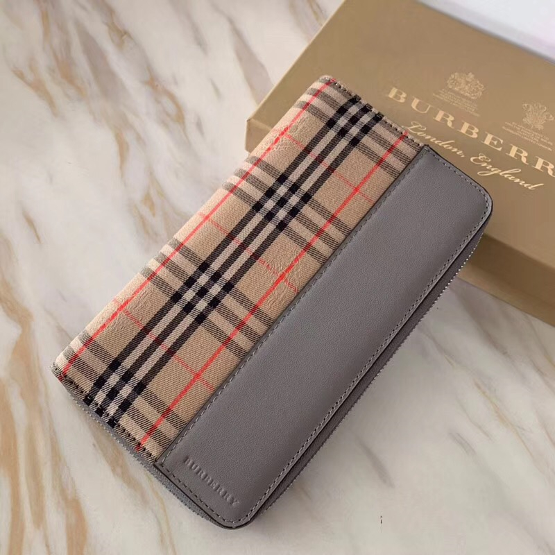 40780591 Burberry巴宝莉 最新 1983格纹拼皮革 全拉链长款钱夹 灰色