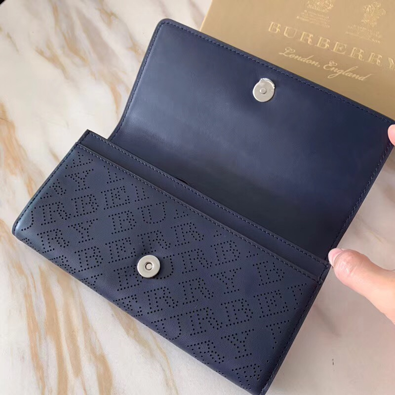 Burberry巴宝莉 激光冲孔式纹案 皮革 翻盖 两折长款钱包 深蓝色