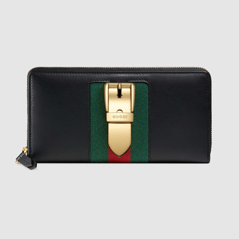 476083 GUCCI Sylvie 系列 皮革 红绿尼龙织带拼皮 全拉链式皮夹 黑色