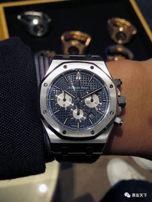 此外,新式表款的计时码表按把护筒也从过往的旋入式,改為让佩戴者更好操作的按压式。而这次推出的蓝面腕表,色彩选用上似乎低调了些,但是若仔细鑑赏製表做工上的细节,无论是品牌最具特色的「Grande Tapisserie」大型格纹,甚或是小表盘、按把护筒、鍊带连节上的细緻打磨纹路,处处细节都能看出爱彼表在品质上的始终坚持。老实说,每每戴上爱彼的表款,那扎实的质感、打磨的细緻和稳重的外型与配色,总是让人捨不得将它脱下。