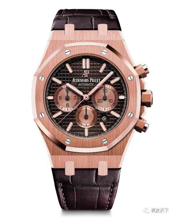 爱彼皇家橡树计时码表,型号26331OR.OO.DCR.01,18K玫瑰金表壳,鱷鱼皮表带,棕色表盘。