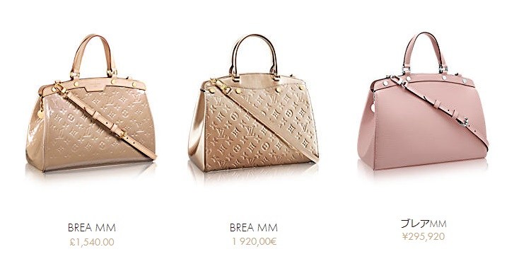 比如Pallas 和Pallas Shopper, 在英国都是1450英镑, 到了法国分别是1840欧元和1880欧元,Pallas Shopper贵出来40欧元;而在日本,分别是302,400日元, 288,360日元,Pallas Shopper反而便宜了1万多日元。
