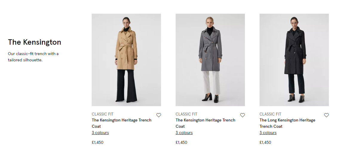 The Kensington是品牌一直主推的正统经典款,全部沿用经典设计。5*2 10扣双排扣设计,两侧扣子的距离较开,整体剪裁偏中性,剪裁比Chelsea宽松一些。2种长短 94.5cm/104.5cm,3种颜色,价格统一为£1,450。