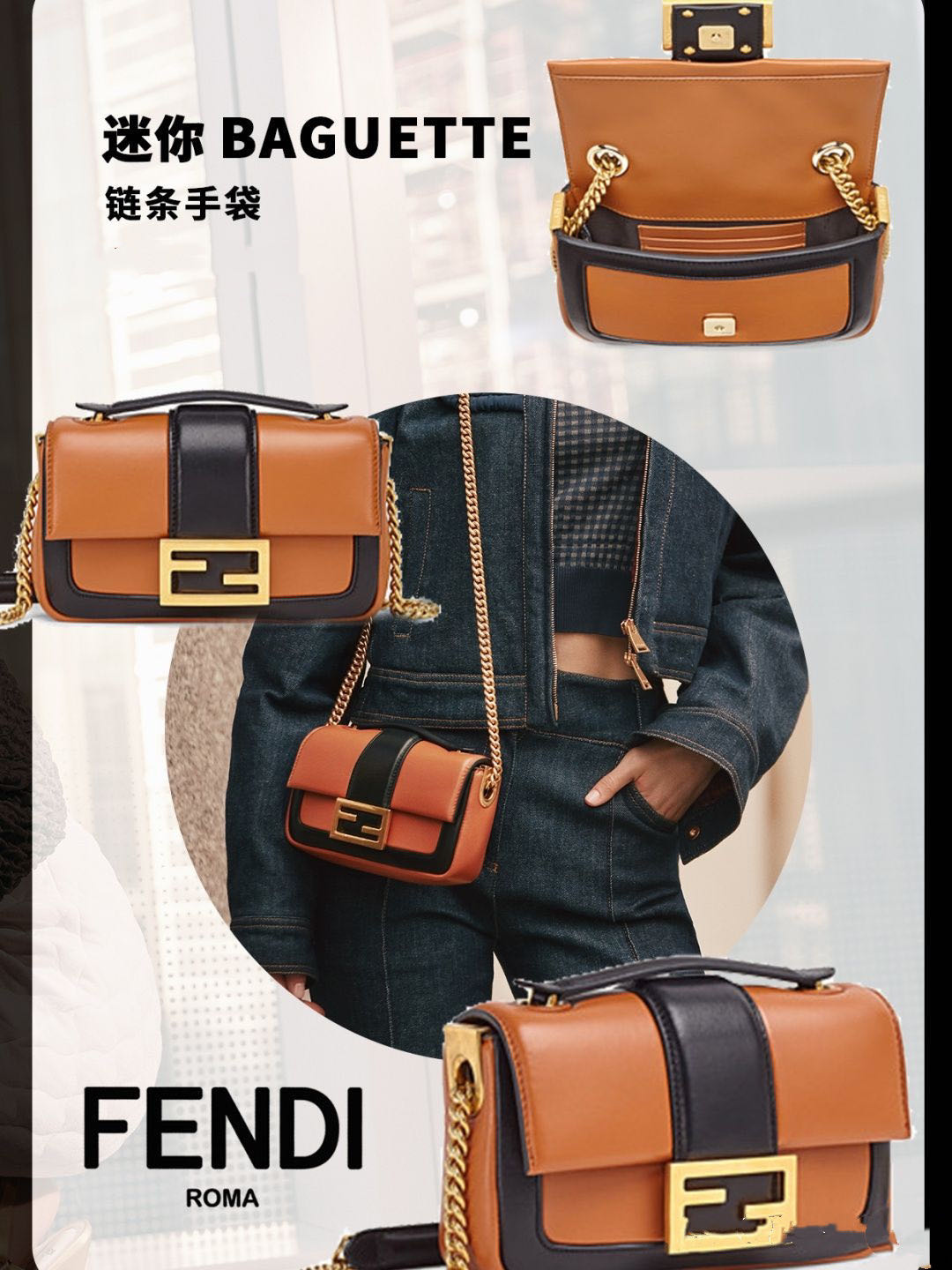 第二组 迷你BAGUETTE链条手袋 这款包包长度只有19cm,非常小巧,但容量到不小,这款就是对于喜欢小包的朋友们了,精致又百搭。柔软的黑色和棕色纳帕羊皮材质,配有滑链,饰有金属FF搭扣。整体色调就很有感觉,这款当做手提包也是不错的选择,多重搭配