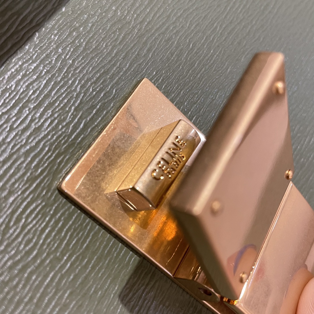 CELINE BOX整个包的五金部分都是纯铜表面电镀24k真金,五金表面的做旧效果是通过振机打磨,也就是机器反复撞击后形成的“磨花”效果,不过要强调的是,虽然五金看起来“磨花”,实际上表面非常的光滑。