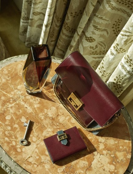 由艺术总监Clare Waight Keller设计的GIVENCHY纪梵希2018早秋系列亚麻色皮革GV3手袋,紫红色绒面拼接GV BUCKET手袋及同色系绒面拼接GV3手袋。