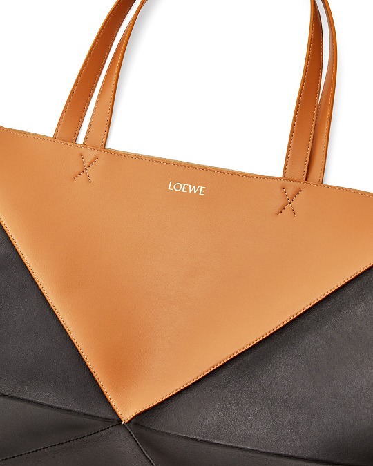 大号 Puzzle Fold Tote 采用暖沙色和黑色亮面小牛皮拼接而成,拼色设计与包身线条巧妙融合,凸显 Puzzle 系列标志性的几何剪裁。独特的拼缝手法让包包能够沿着缝线灵巧折叠成平整的小方块,集实用性与趣味性于一体。